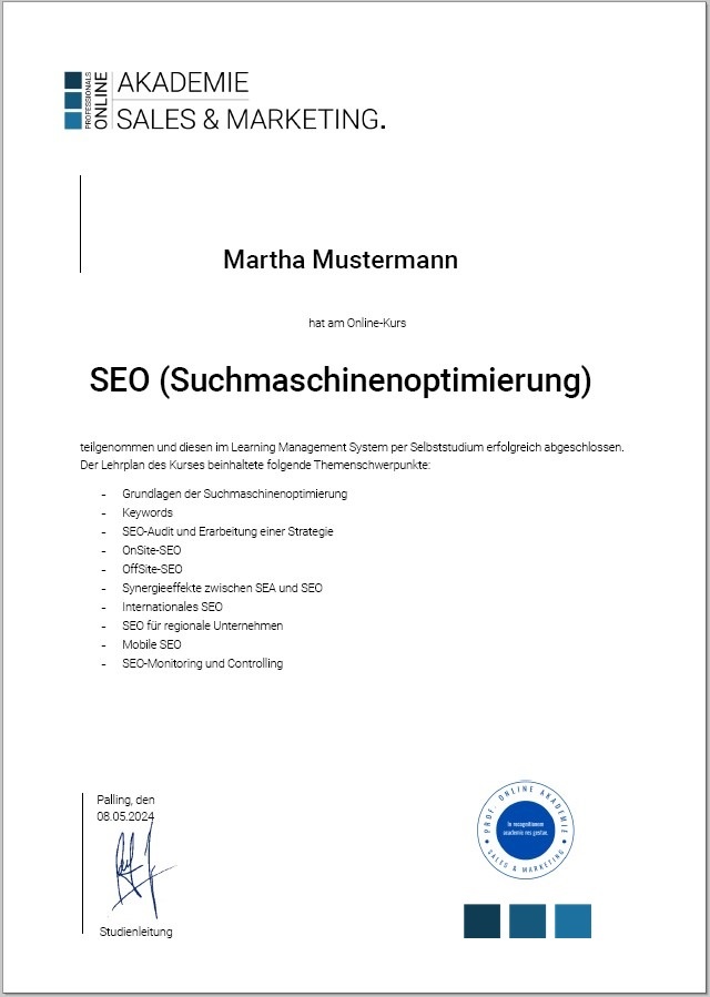 In der Weiterbildung SEO (Suchmaschinenoptimierung) beschäftigen wir uns ausführlich mit der Onsite- und Offsite-Optimierung. Zentraler Bestandteil sind die Keywords, für die wir Strategien erarbeiten und operative Maßnahmen ergreifen. Zuvor erfassen wir mit einem SEO-Audit die Ausgangssituation, definieren anschließend Ziele und setzen diese in die Praxis um. Dabei berücksichtigen wir auch Mobile SEO und führen am Ende des SEO-Audits ein entsprechendes Controlling der Maßnahmen durch. Jedes Unternehmen, das online sichtbar ist, benötigt ein gutes Ranking in den Suchmaschinen, um Sichtbarkeit und Besucher zu generieren. SEO ist daher von essentieller Bedeutung, so dass Experten bzw. Expertinnen gefragt sind, die Top-Positionen erreichen können.